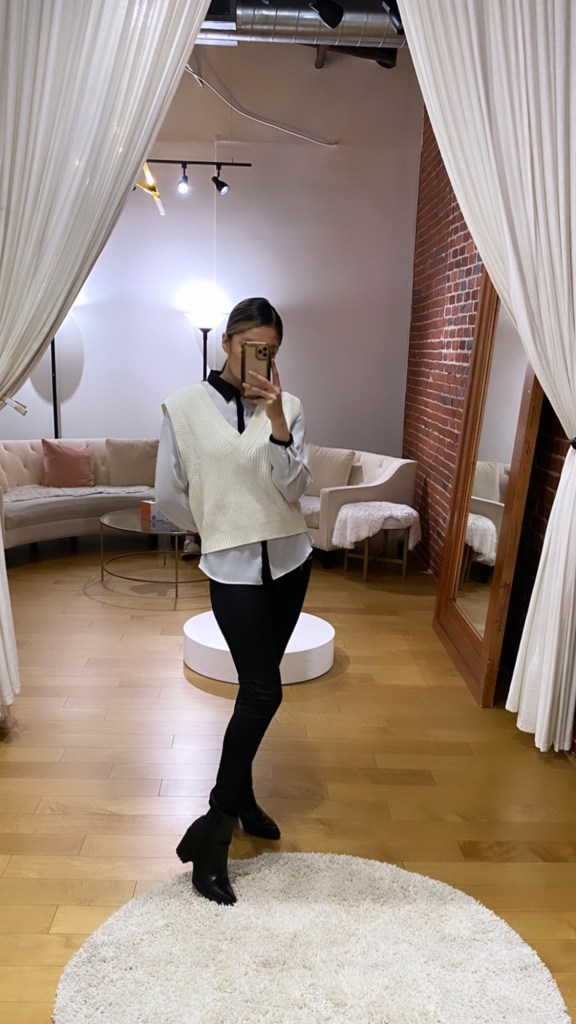 With the weather starting to get slightly warmer, I wanted to wear something light, but still warm. I wore a blouse and paired it with my ivory sweater vest and dressed it up with my leather pants and boots.
