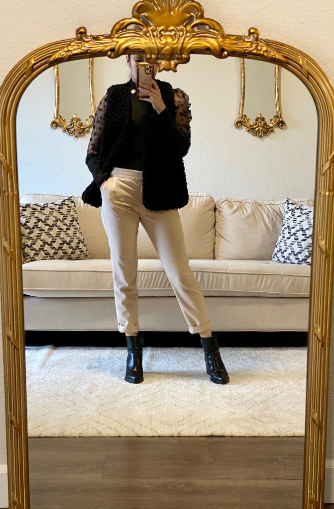 Another contrast look I put together, using my Express dress pants. I love my polka dot top, so I paired it with my fur vest and ankle boots.