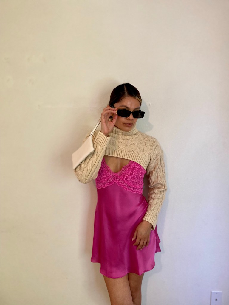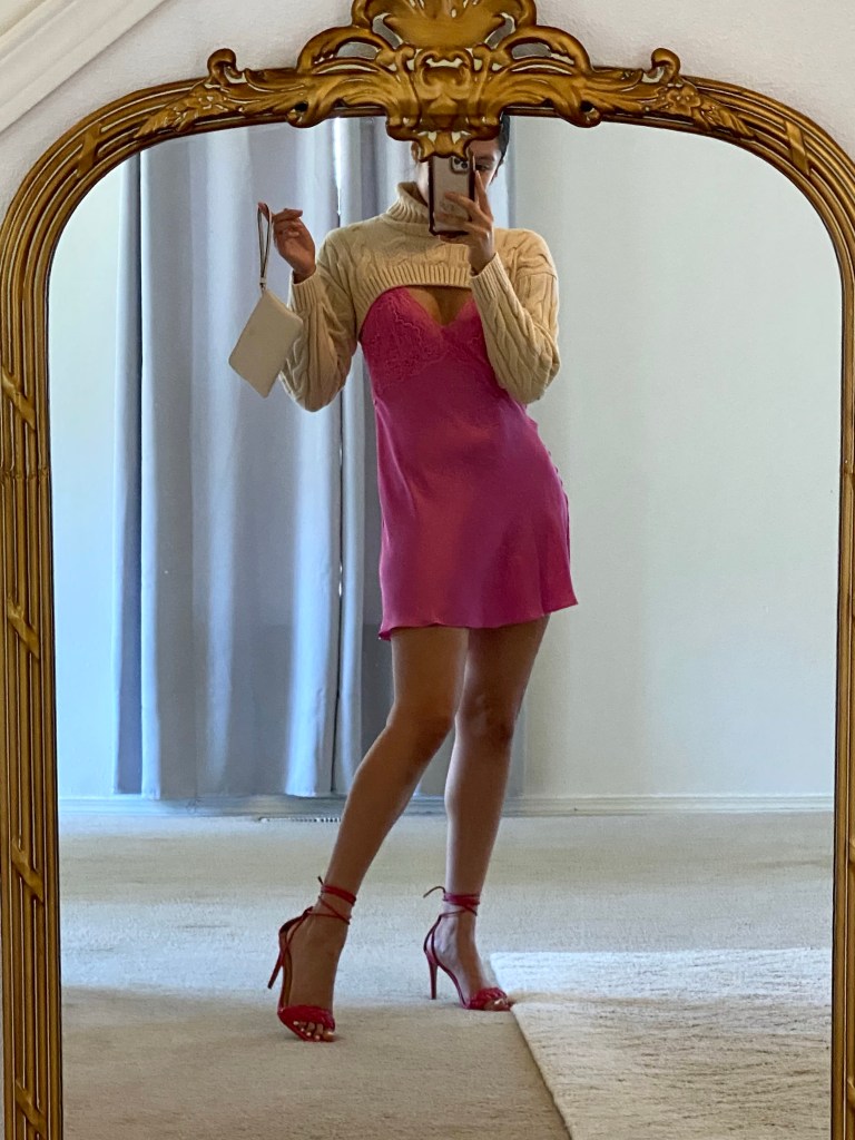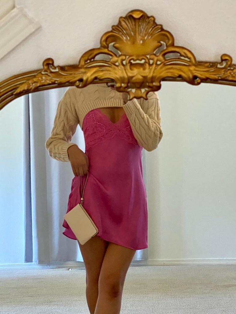 Pull out your favorite pink slip dress and pair it with a sweater yoke for a date night! Modify the look with a blazer or a comfortable heel for a casual chic look.